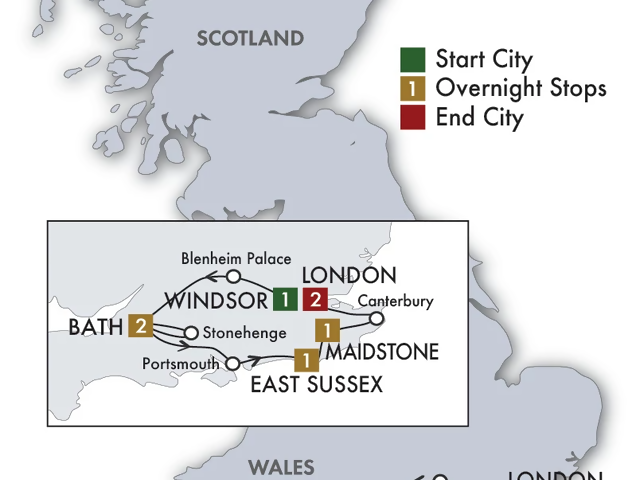 Travel to Blenheim Palace, the magnificent country house once home to Winston Churchill and often seen as the setting for popular TV shows and movies; tour the house and explore the gardens. Set off on a drive through the rolling hills of the quintessentially English Cotswolds, with charming villages and colorful gardens. Arrive in Bath, a striking city of honey-colored Georgian buildings with an ancient heritage. Take a walking tour of the city before visiting the famed Roman Baths. Dine at your hotel this evening. (B, D)