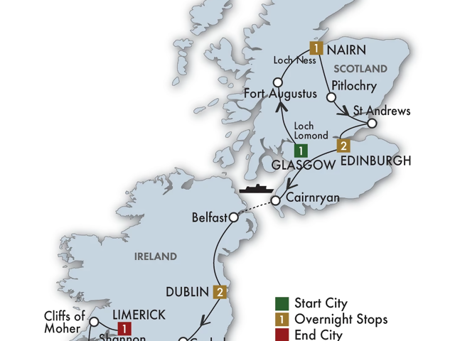 Depart Edinburgh and travel through Ayrshire and along the coast. Embark on a ferry ride to Belfast. Take a panoramic drive through Belfast, seeing the highlights of this fascinating city, where the Titanic was built in the once-bustling shipyards. Visit Titanic Belfast to explore the fascinating story of the doomed ship. Then travel to Dublin, where you will enjoy free time for dinner on your own. (B)