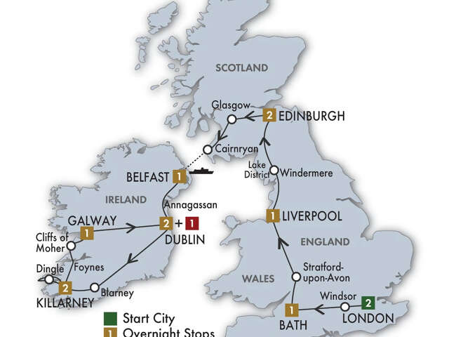 Travel to Glasgow for a city tour and then some time to explore this thriving cultural hub. Then, travel through scenic countryside for a short ferry ride to Ireland and arrive at your Belfast hotel. (B, D)