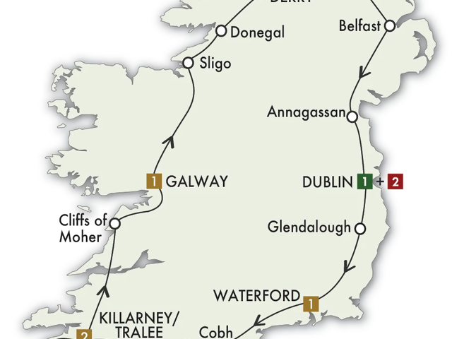 Discover Ireland’s most popular scenic drive, the Ring of Kerry. In the beautiful Gap of Dunloe, find a keepsake at our CIE Tours preferred shopping partner, Moriarty’s. Along the way, stop for lunch, stroll around Sneem, and take in the panoramic views at Moll’s Gap. Enjoy a free evening in Killarney, with time for dining independently and perhaps a visit to one of the town’s lively pubs. (B, L)