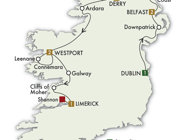 Drive north along the Nine Glens of Antrim for views of mountains, valleys, and coastline. This scenic region is one of the locations for “Game of Thrones.” Stop for photos at the ruins of Dunluce Castle. Explore the Giant’s Causeway, enormous hexagonal columns formed by volcanic activity 60 million years ago. In Derry, join a local guide for a short walking tour around the defensive walls that encircle the compact old city. Then visit the Walled City Brewery, an award-winning CIE Tours Exclusive venue, for dinner and a flight of their craft beers. (B, D)