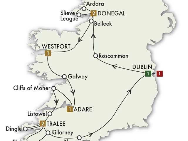 Embark on a tour of the Ring of Kerry, Ireland's most famous and popular scenic drive. Stop at Moriarty's in the beautiful Gap of Dunloe, a CIE Tours preferred shopping partner. Continuing on the scenic drive, pause for panoramic mountain views at Moll's Gap. Stop at Atlantic Irish Seaweed for a guided walk along the shoreline and enjoy a few seaweed nibbles. Visit Killarney for free time to explore before returning to Tralee, where you may dine as you wish. (B)