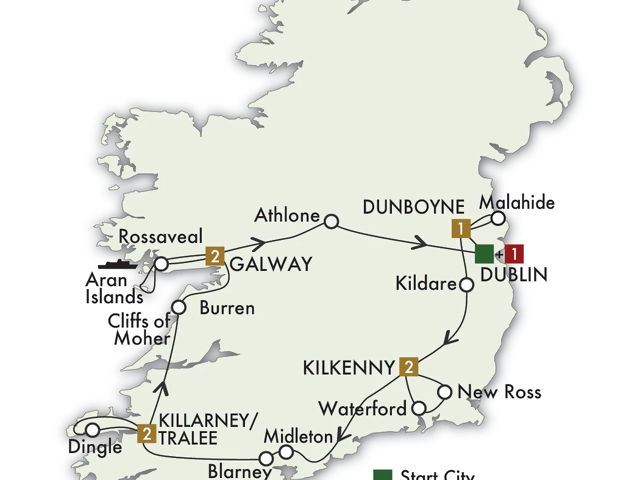 - 8 breakfasts (B), 2 lunches (L) and 6 dinners (D) including a welcome dinner at Dunboyne Castle Hotel.