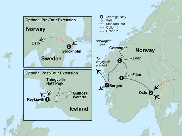 Venture to a place where crashing ocean meets craggy mountains, forging the awe-inspiring majesty of the Norwegian fjords. Start in Bergen, a city in the heart of the fjords with the charm of a small town. Journey on one of the world’s steepest train rides, the legendary Flåm Railway, past rushing waterfalls, looming mountains, and picturesque valleys. Relax in the Norwegian countryside, where you’ll wake up amongst breathtaking mountain vistas and fjords. Cruise the crystal waters of the Geirangerfjord. Walk the streets of Oslo, taking in the capital’s iconic sights. From Bergen to Oslo, you’ll be awestruck by the grandeur of Norway.