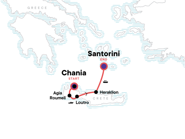 Your Welcome Moment: Meet Your CEO and Group. Samariá Gorge hike. Beach time at Agia Roumeli and Loutro. Palace of Knossos visit. Orientaion walk of Fira. Caldera walk from Fira to Oia on Santorini. All transport between destinations and to/from included activities.
