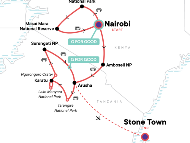 Your Welcome Moment: Meet Your CEO and Group. Lake Nakuru sunset safari drive. Maasai Mara village visit and national park safari. Full-day Maasai Mara National Park Safari. Safari drive in Amboseli National Park. Two safari drives in Tarangire National Park. Coffee harvesting tour in Karatu. Scenic safari drive in Ngorongoro Crater. Sunset safari drive in Serengeti. Full-day safari drive in Karatu and Serengeti National Park. Stonetown Orientation Walk. Spice Tour Zanzibar. Free time in Lake Nakuru National Park, Serengeti National Park, and Zanzibar. Internal Flight to Zanzibar. All transport between destinations and to/from included activities.