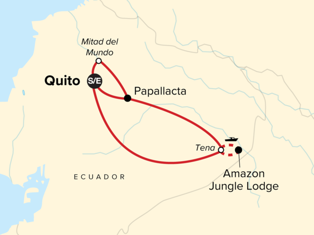 Your Local Living Moment: Kichwa Family Visit, Tena. Complimentary arrival transfer. Historical walking tour of Quito. Mitad del Mundo and the Intiñan Museum visit. Lunch overlooking the crater of Pululahua Volcano. Papallacta thermal pools. Amazon rainforest jungle (3 nt) stay. Guided jungle walk. Local community visit and taste of regional specialties. River tubing. Chocolate house visit. Misicocha Reserve Jungle Trek. Caiman Lagoon visit. Free time in Quito, Papallacta, & the Amazon Jungle. All tips included for activities and meals, except for Expedition Leaders and porterage. All transport between destinations and to/from included activities