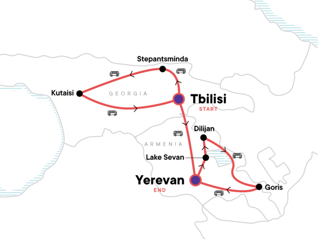 Your Foodie Moment: Gata-Making Class, Dilijan. Tbilisi walking tour and Caravanserai Visit. Gergeti Trinity Church excursion. Friendship Monument visit. Gori Visit. Explore the ancient Uplistsikhe archaeological site. Kutaisi orientation walk. Martvili Canyon Boat Ride and Walking Trail. Visit Mtskheta and the Svetitskhoveli Cathedral. Visit Yerevan's Republic Square. Megerian Carpet Museum Visit. Duduk musical demonstration. Walking Tour of Dilijan. Visit Khor Virap Monastery. Explore the Areni-1 Cave Complex. Orientation Walk in Goris. WINNET Goris Foundation Visit. Wings of Tatev Cable Car and Monastery Visit. All transport between destinations and to/from included activities.