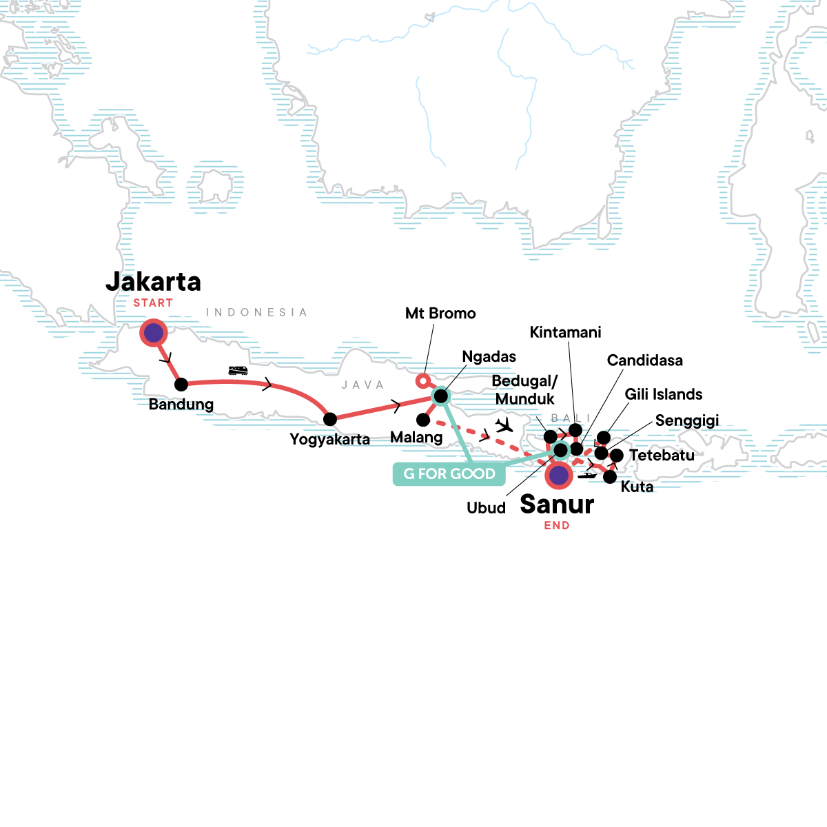 Your Discover Moment: Ubud. Jakarta city tour. Prambanan temple complex visit. Borobudur visit. Mt Bromo sunrise visit. Beach time in Sanur. Jatiluwih Rice Terraces visit (UNESCO-protected). Lake Bratan temple visit. Highlands of Kintamani visit. Mt Batur view. Local Indonesian meal experience. Kerta Gosa visit. Ubud orientation walk. Sasak village visit. Snorkelling trip. Easy trekking in Tetebatu. Sendang Gila Waterfall swim. Free time on the white-sand beaches of the Gili Islands. Internal flight. All transport between destinations and to/from included activities.