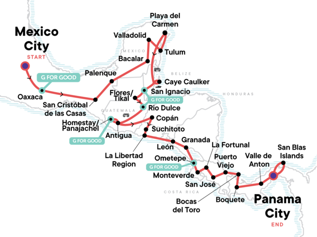 Your Big Night Out Moment: Panama City. Mexico City street food crawl. Alebrijes Artisan Community visit. Boat trip to Sumidero Canyon. Stop at Roberto Barrios Waterfall for a swim. Tour the Mayan ruins in Palenque. A catamaran adventure into a gorgeous lagoon in Bacalar. Chichen Itzá ruins guided tour. Guided tour of Tikal. Orientation walk in Antigua, Leon, and Granada. Beach time in Playa del Carmen and Caye Caulker, and El Tunco. CEO-led Orientation Walk of Puerto Viejo. Biking Puerto Viejo. CEO-led Orientation Walk - Bocas del Toro. Starfish Beach Visit. Panama City CEO-led Orientation Walk. 3-night San Blas Islands Stay supporting the local ingenious community. Guna Indigenous Community Visit & Presentation. Island Visits. Free time for beach, snorkelling, swimming, and lounging. Free time in Mexico City, Oaxaca, Palenque, San Cristóbal de las Casas, Playa del Carmen, Caye Caulker, Antigua, Granada, Ometepe, Monteverde, La Fortuna, Puerto Viejo, Bocas del Toro, Boquete, Valle de Anton, Panama City, & San Blas Islands. All transport between destinations and to/from included activities.
