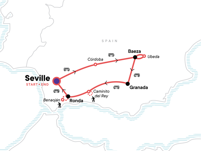 Your OMG Day: Sacramonte and Flamenco Show or Granada Food Tour, Granada. Welcome dinner. Guided walking tour of Córdoba. Evening orientation walk of Baeza. Explore the town of Úbeda with a local guide. Orientation walk of Granada. Guided visit of the Alhambra. Caminito del Rey Trail hike with a local guide. CEO-led hike to Benaoján in Sierra de Grazalema Natural Park. Guided walking tour of Ronda. Farewell dinner. All tips included for activities and meals, except for CEO and porterage. All transport between destinations and to/from included activities.