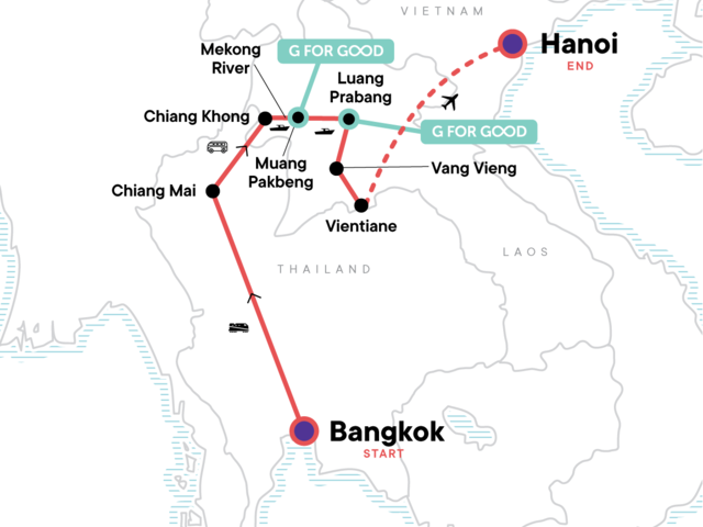 Your Discover Moment: Luang Prabang. Bangkok klong trip. Wat Pho entrance and guide. Doi Suthep entrance (Chiang Mai). Mekong River slow boat excursion. Pak Ou caves entrance (Luang Prabang). Traditional Arts & Ethnology Museum guided tour. Ock Pop Tok Living Crafts Centre. Meal with local Baan Ou Community. Kuang Si waterfalls trek (half-day). Water puppets performance (Hanoi). Ho Chi Minh Mausoleum entrance (when open). Internal flight. All transport between destinations and to/from included activities.