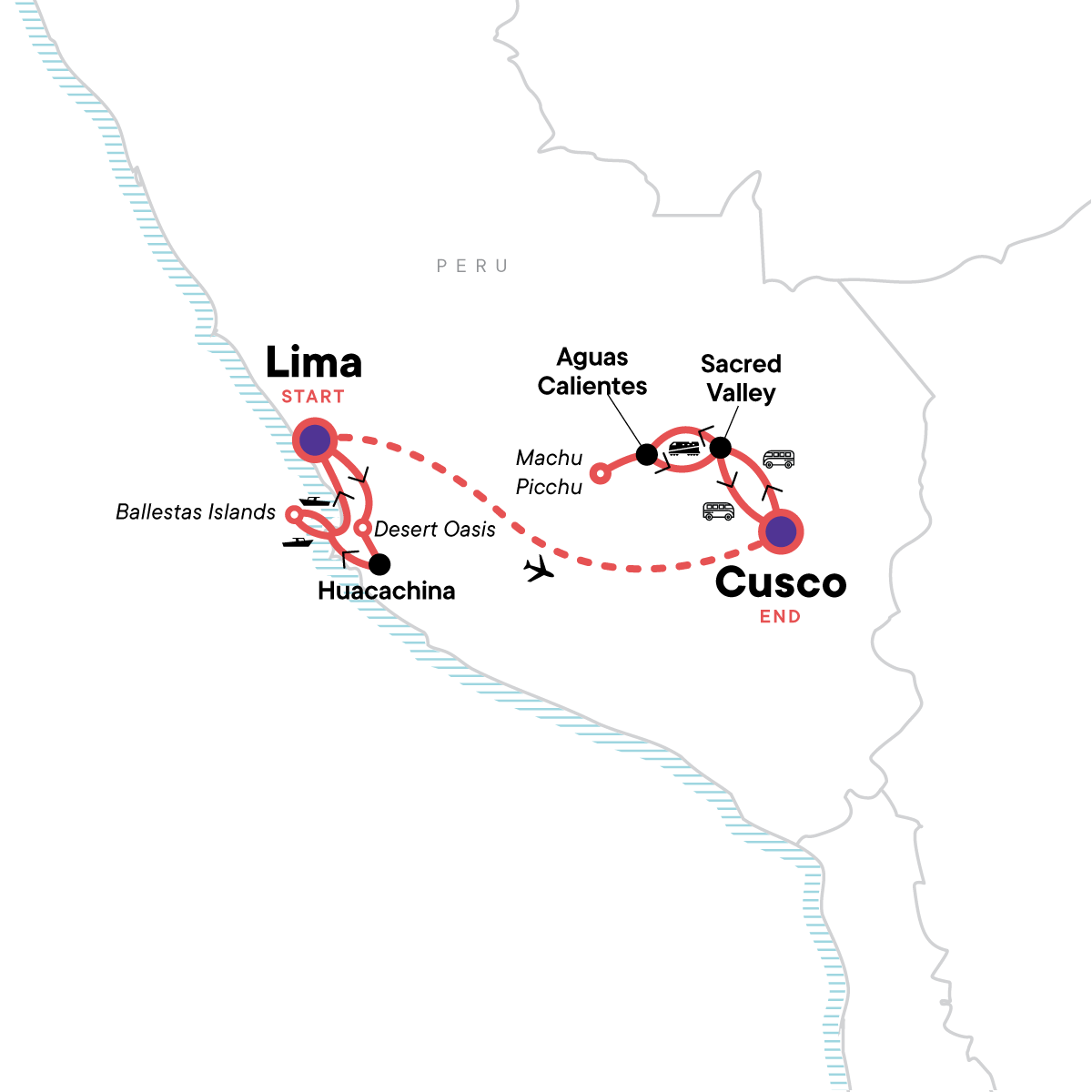 Your Foodie Moment: Seafood Lunch at the beach, Cerro Azul. Seafood lunch near the beach in Cerro Azul. Sandboarding and dune buggy excursion to a desert oasis. Boat excursion to spot wildlife at the Ballestas Islands. Insiders walking tour of Cusco with local lunch. Visit Killarumiyoq and Iglesia Ñaupa archaeological sites. Hike to Perolniyoc Waterfall in the Sacred Valley. Train to Machu Picchu. Machu Picchu guided tour. All transport between destinations and to/from included activities.
