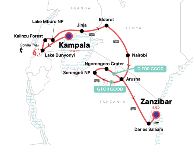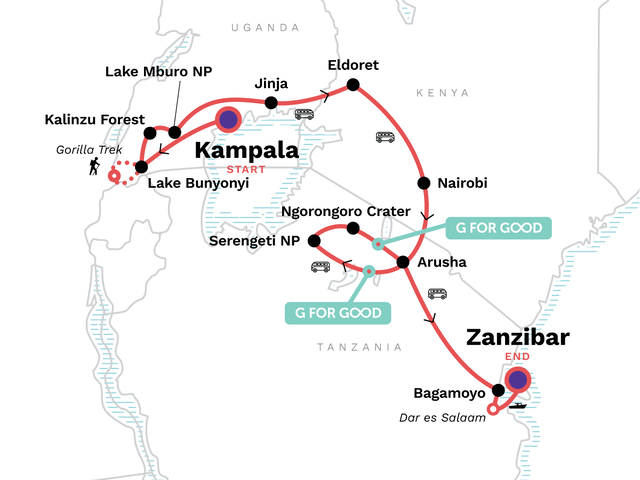 Witness the wildlife of Uganda, lounge on the sunny beaches of Zanzibar, and spend 19 days journeying overland across East Africa. From tracking mountain gorillas through remote forest for a once-in-a-lifetime experience, to pursuing the elusive "big five" across open savannah and camping in the remote wilderness, this trip is for the adventurous spirit dreaming of reaching some of the wonders of this vast continent.